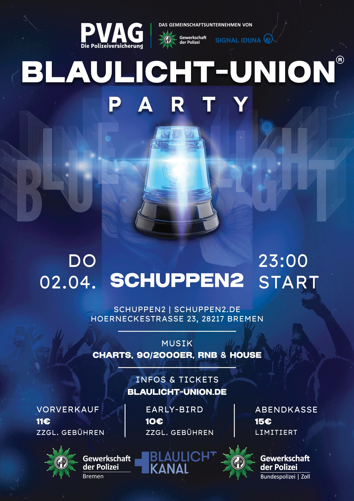 Die Blaulicht-Union Party findet erneut in Bremen statt. Fernab vom täglichen Dienst dient der Schuppen 2 dabei als perfekte Location, um unter Gleichgesinnten zu feiern, entspannte Gespräche und Small Talk bei kühlen Drinks zu führen. Aus diesem Grund werden aus ganz Bremen und Umgebung Polizisten, Feuerwehrleute, Krankenschwestern, Ärzte, Sanitäter und all diejenigen, die rund um die Uhr für das Wohl ihrer Mitmenschen arbeiten, erwartet. Auch Freunde von Helfern und Rettern sind herzlich eingeladen.