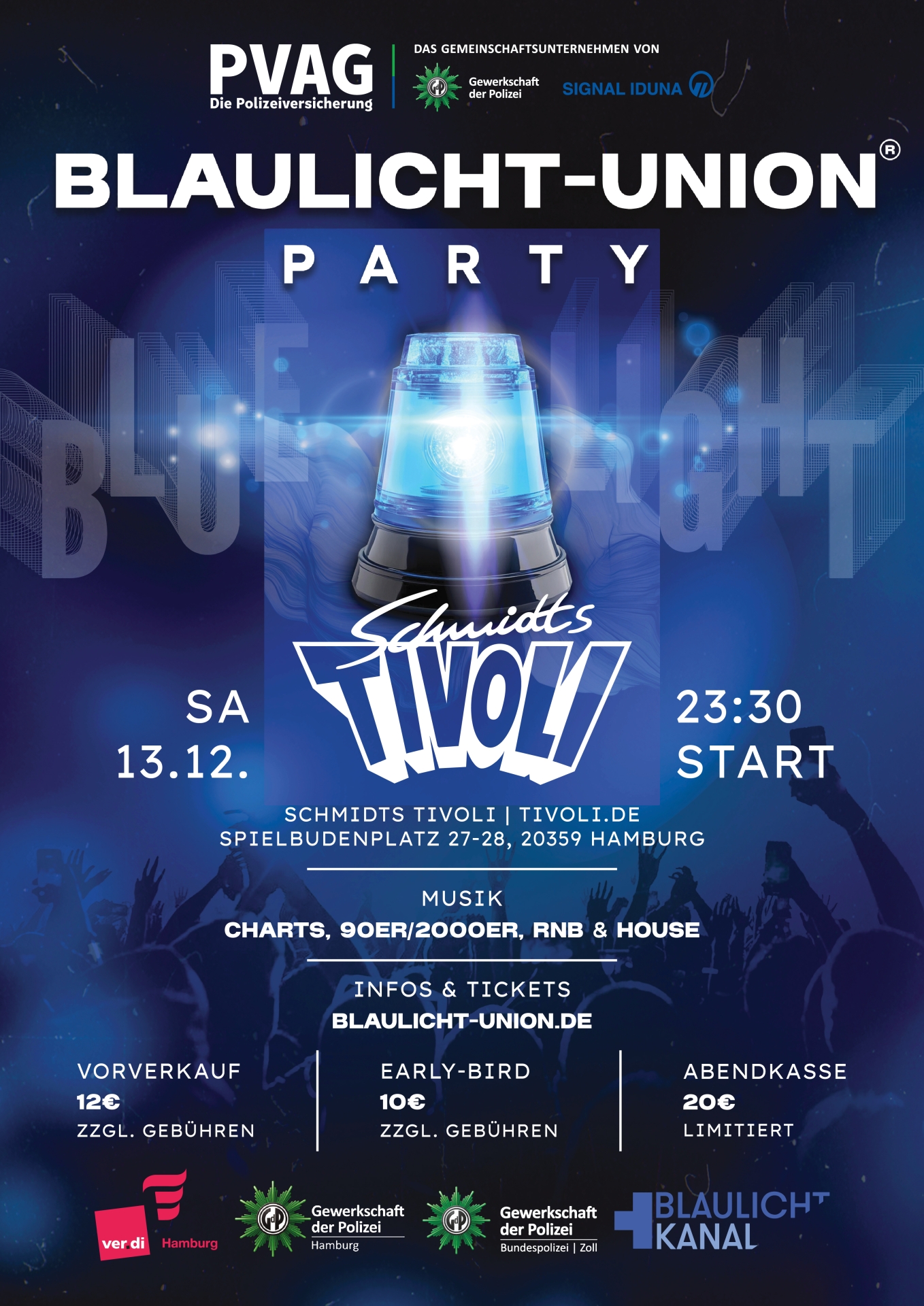 Die Blaulicht-Union Party findet erneut in Hamburg statt. Fernab vom täglichen Dienst dient das Schmidts Tivoli dabei als perfekte Location, um unter Gleichgesinnten zu feiern, entspannte Gespräche und Small Talk bei kühlen Drinks zu führen. Aus diesem Grund werden aus ganz Hamburg und Umgebung Polizisten, Feuerwehrleute, Krankenschwestern, Ärzte, Sanitäter und all diejenigen, die rund um die Uhr für das Wohl ihrer Mitmenschen arbeiten, erwartet. Auch Freunde von Helfern und Rettern sind herzlich eingeladen.