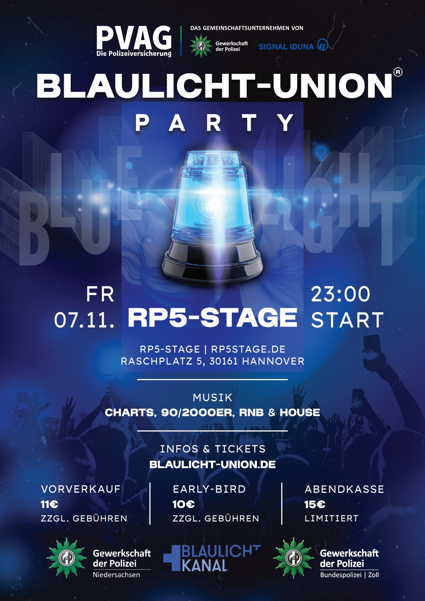 Die Blaulicht-Union Party findet erneut in Hannover statt. Fernab vom täglichen Dienst dient das RP5 Stage dabei als perfekte Location, um unter Gleichgesinnten zu feiern, entspannte Gespräche und Small Talk bei kühlen Drinks zu führen. Aus diesem Grund werden aus ganz Hannover und Umgebung Polizisten, Feuerwehrleute, Krankenschwestern, Ärzte, Sanitäter und all diejenigen, die rund um die Uhr für das Wohl ihrer Mitmenschen arbeiten, erwartet. Auch Freunde von Helfern und Rettern sind herzlich eingeladen.
