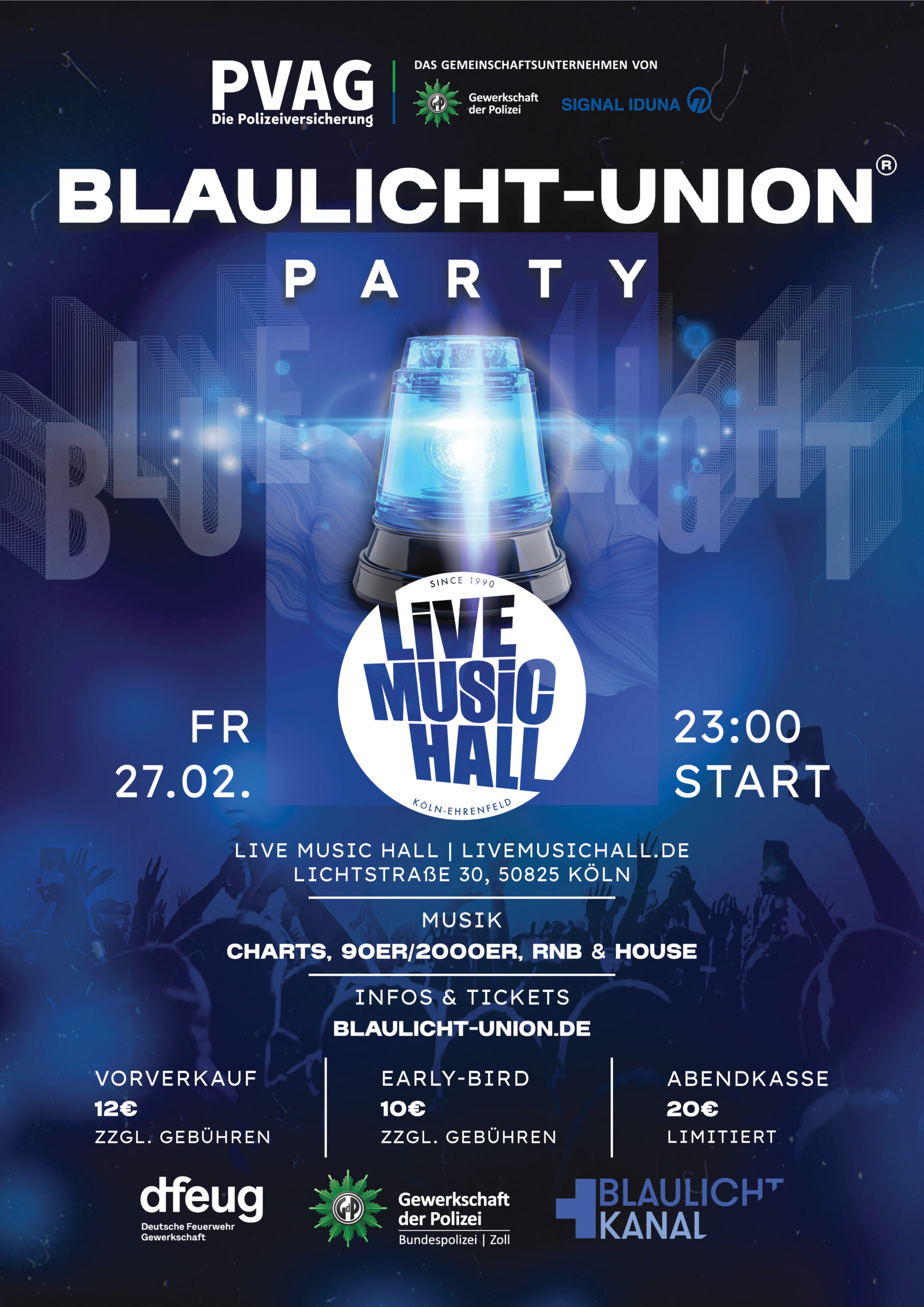 Die Blaulicht-Union Party findet erneut in Köln statt. Fernab vom täglichen Dienst dient die Live Music Hall dabei als perfekte Location, um unter Gleichgesinnten zu feiern, entspannte Gespräche und Small Talk bei kühlen Drinks zu führen. Aus diesem Grund werden aus ganz Köln und Umgebung Polizisten, Feuerwehrleute, Krankenschwestern, Ärzte, Sanitäter und all diejenigen, die rund um die Uhr für das Wohl ihrer Mitmenschen arbeiten, erwartet. Auch Freunde von Helfern und Rettern sind herzlich eingeladen.
