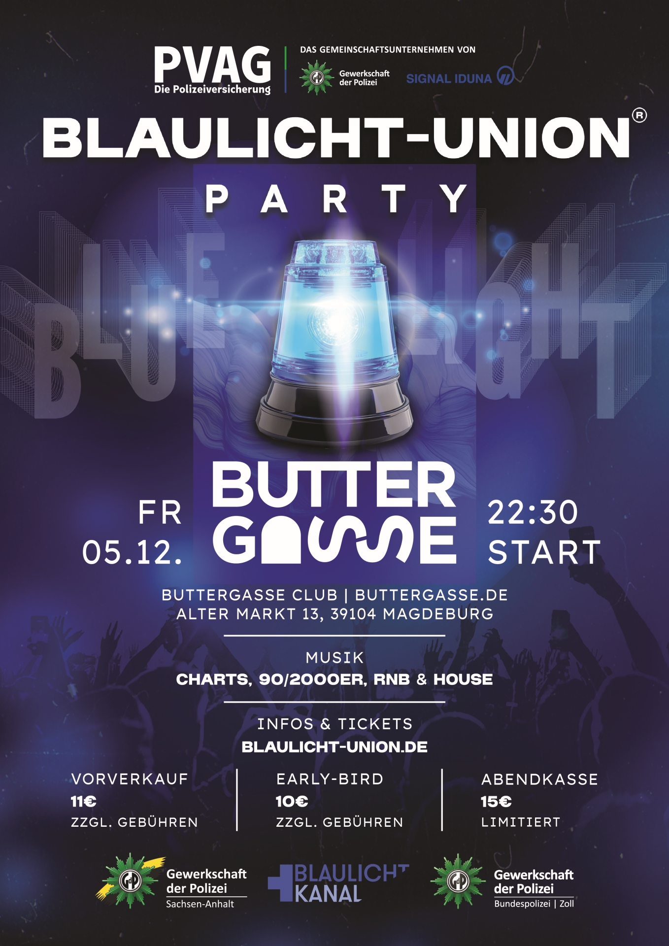 Die Blaulicht-Union Party findet erneut in Magdeburg statt. Fernab vom täglichen Dienst dient der Buttergassen Club als perfekte Location, um unter Gleichgesinnten zu feiern, entspannte Gespräche und Small Talk bei kühlen Drinks zu führen. Aus diesem Grund werden aus ganz Magdeburg und Umgebung Polizisten, Feuerwehrleute, Krankenschwestern, Ärzte, Sanitäter und all diejenigen, die rund um die Uhr für das Wohl ihrer Mitmenschen arbeiten, erwartet. Auch Freunde von Helfern und Rettern sind herzlich eingeladen.