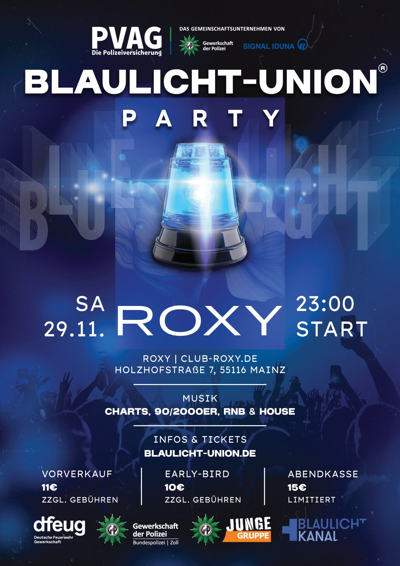 Die Blaulicht-Union Party findet erneut in Mainz statt. Fernab vom täglichen Dienst dient das ROXY dabei als perfekte Location, um unter Gleichgesinnten zu feiern, entspannte Gespräche und Small Talk bei kühlen Drinks zu führen. Aus diesem Grund werden aus ganz Mainz und Umgebung Polizisten, Feuerwehrleute, Krankenschwestern, Ärzte, Sanitäter und all diejenigen, die rund um die Uhr für das Wohl ihrer Mitmenschen arbeiten, erwartet. Auch Freunde von Helfern und Rettern sind herzlich eingeladen.